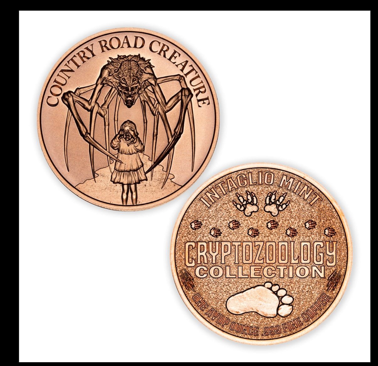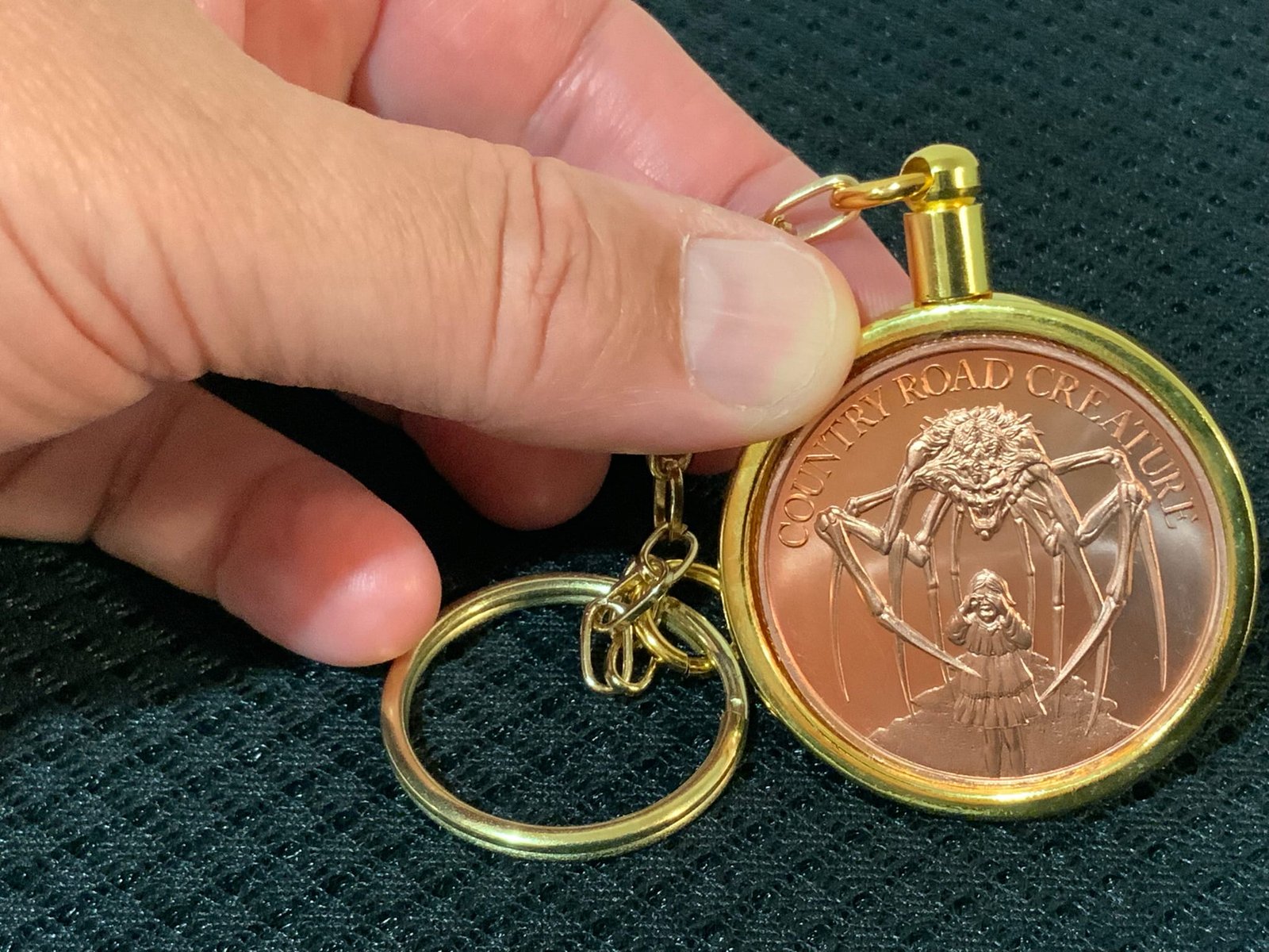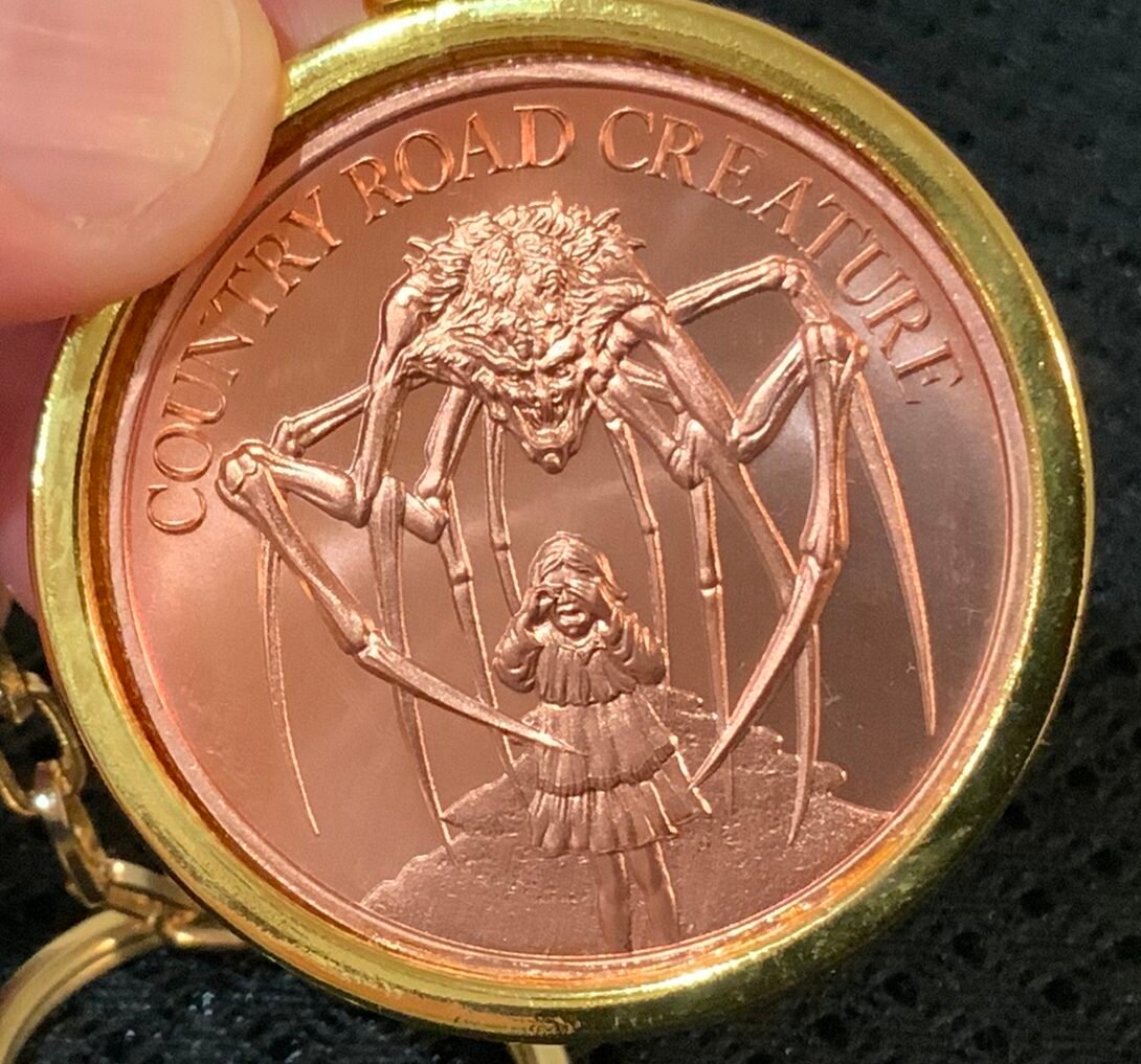 The Country Road Creature Appears to be a Nightmare come alive. You’d expect to see such a Creature on a Farm and depicted in the 1 Ounce Copper Coin Keychain is a Little Girl, who is Terrified of what has Found her. Her tears only create a more Horrifying scenario. It appears in the facial features that the Creature is a Man, become a Spider! Yet there seems to be an intelligence at work here.