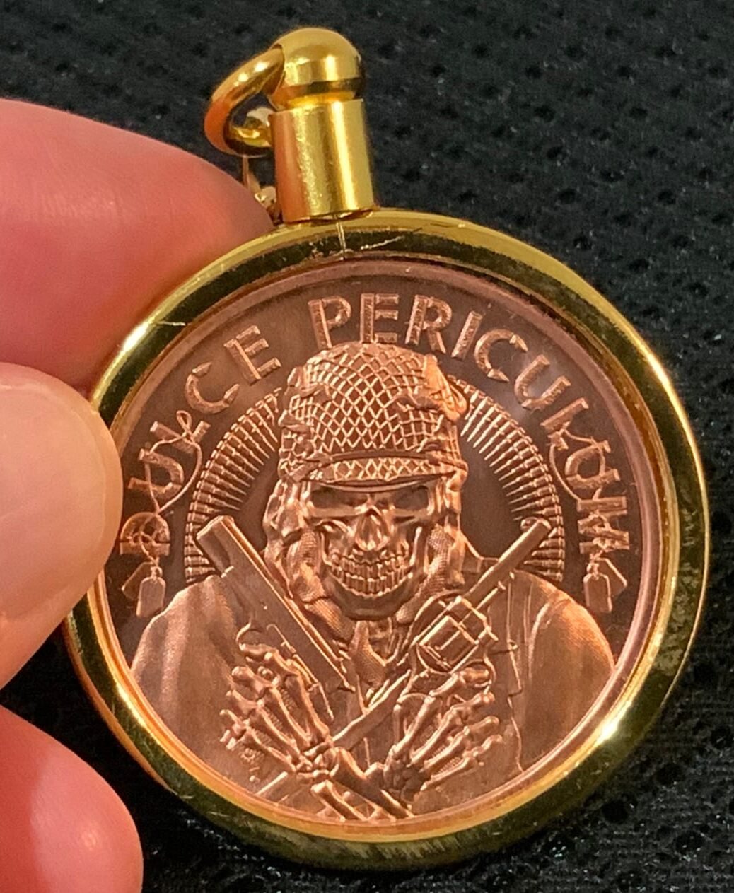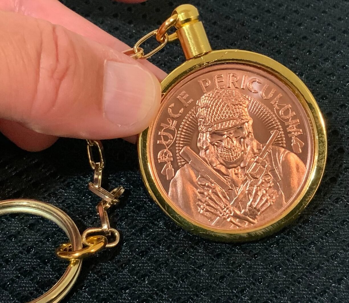 Our “Dulce”, if you will, is One Ounce Pure Copper surrounded by our Golden Plated (Heavy) Bezel, The Keychain will take some Abuse day to day, but is Strong, like its namesake.