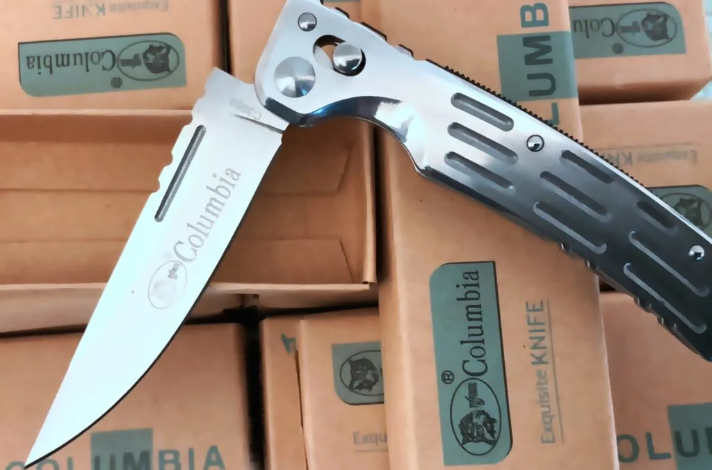 It’s A Stunner. Overlooked in the Bygone Era of Knives, Our Brand New, COLUMBIA BRAND, Stainless Steel Handle + Sharp (7cr13) Blade) And Ultra Sheen (Silver Mirror Finish) Knife Will Assuredly have Your Eyes Popping!