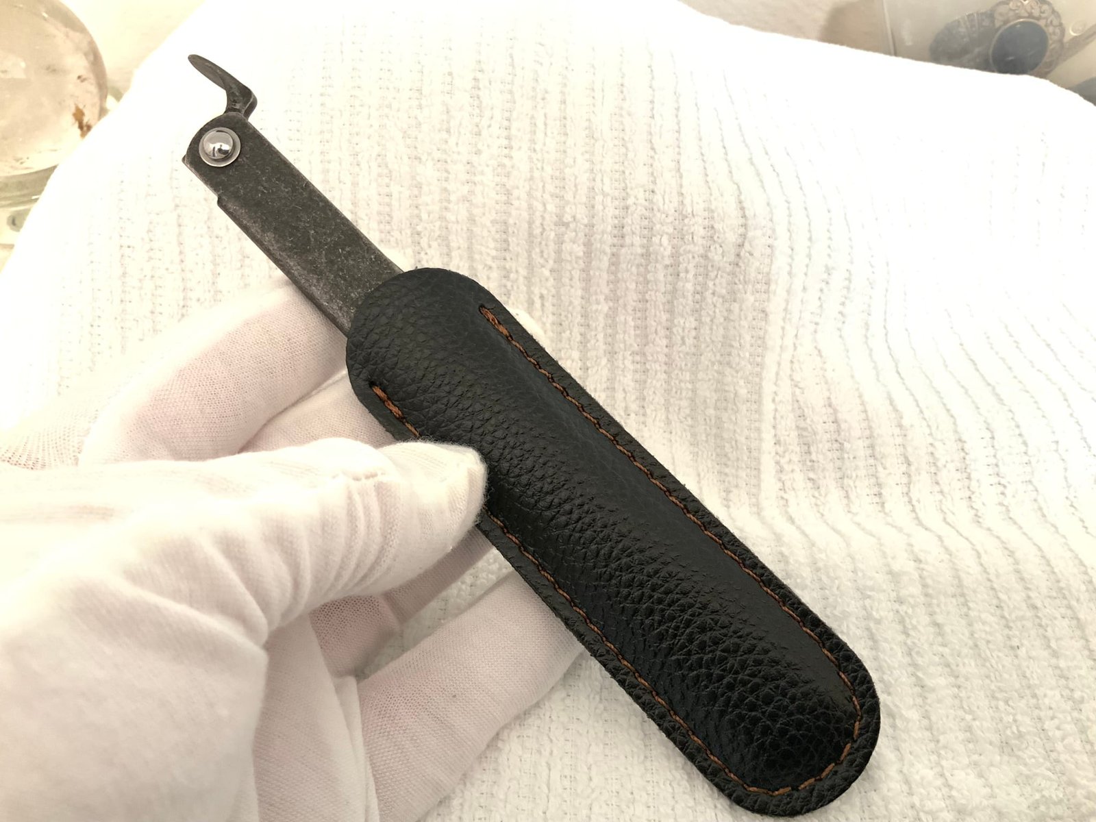 This Knife comes with a nifty black sheath for easy fitting in the Pocket or Purse. You must feel this knife in the hand, as it is Dark Steel, with attractive heft and feel that says REAL.