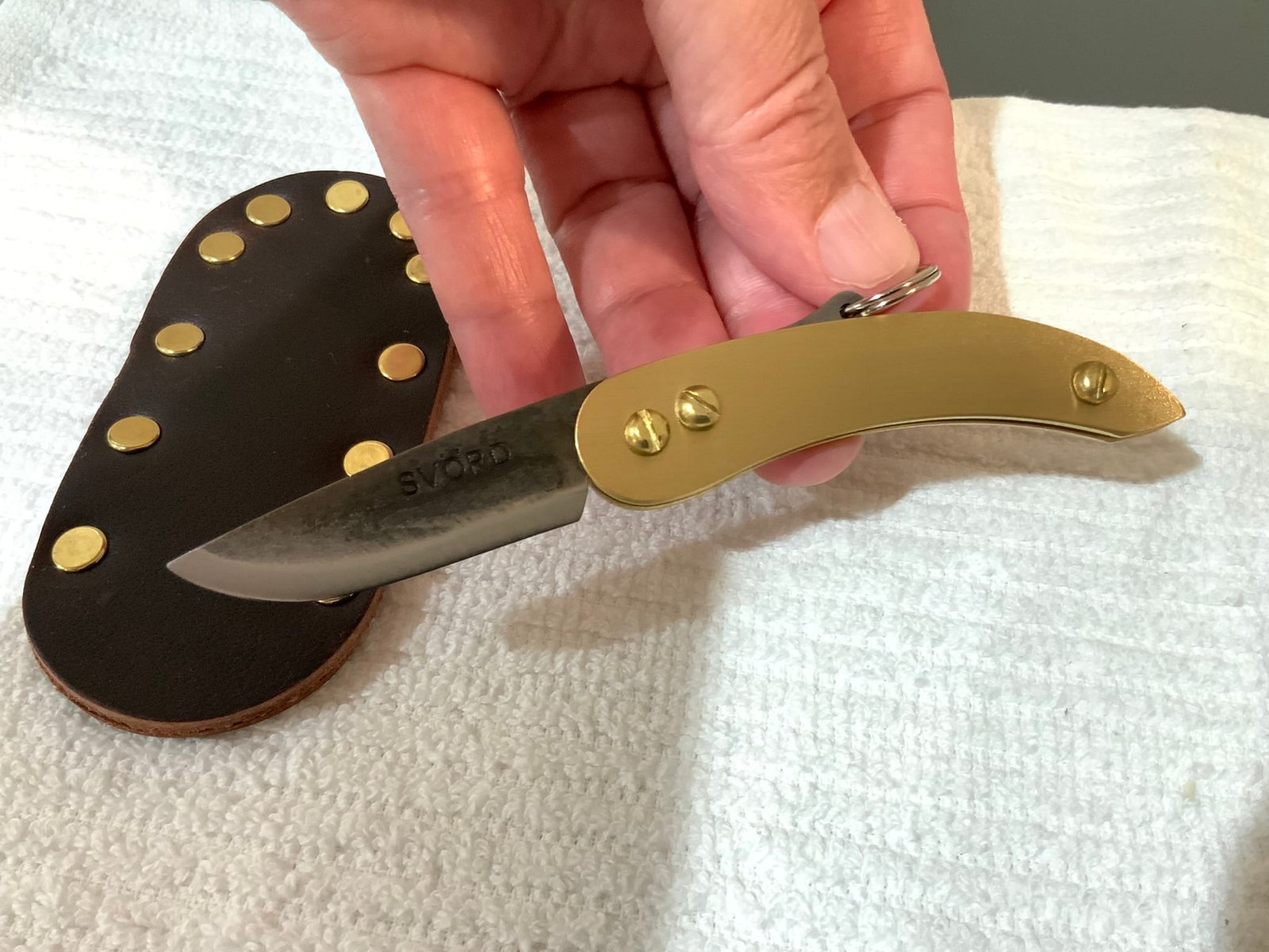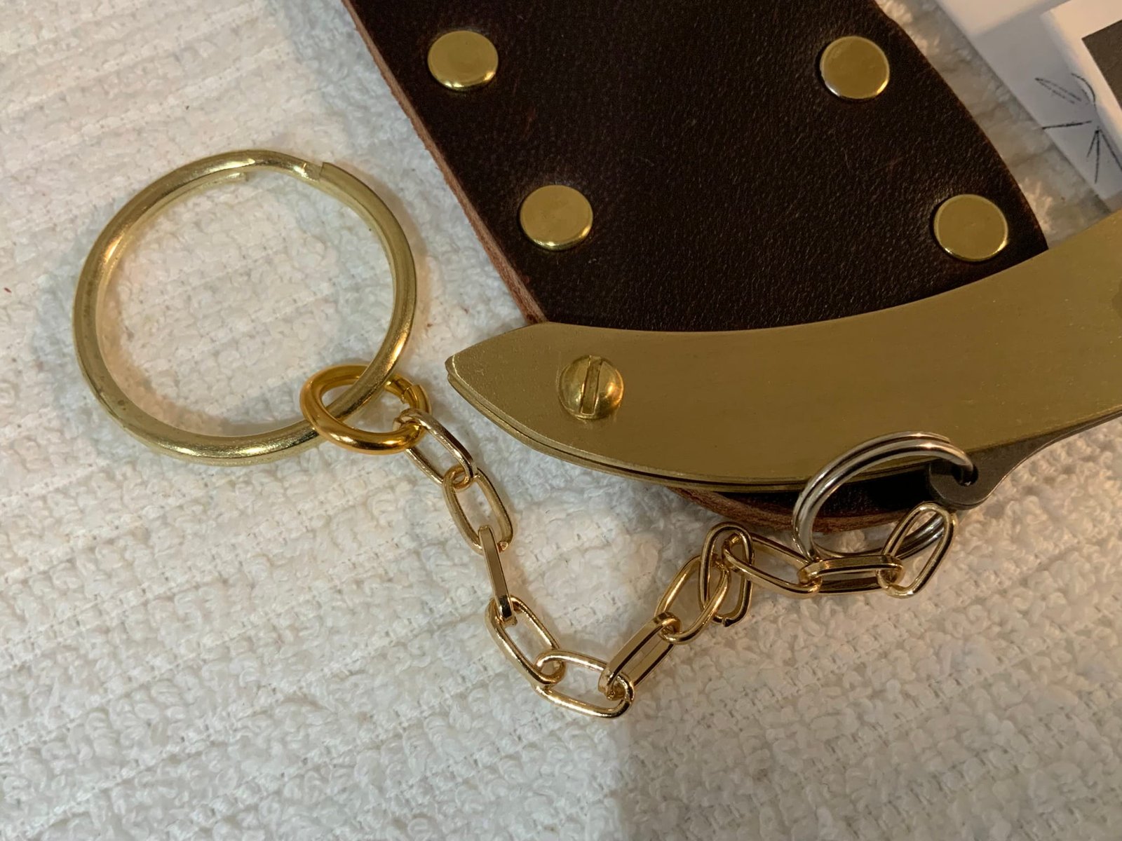 SVORD Peasant Carbon Steel Blade Knife with Blacks Keychain Attachment is certainly worth your Looksie for a new Brass Knife Keychain or otherwise. You can just put aside the Keychain Attachment, but it’s good to keep it in storage in case you change your mind. And why not have an Appropriate attachment for Svord’s Most Popular, Brass Peasant? The Flip is decidedly easy, if you unscrew the screws a bit, and add Black’s 30mm Keychain Ring to it and you have a Nifty Keychain Cutter that’s gonna Sparkle in the Bullet Button Sheath that Svord has Included!
