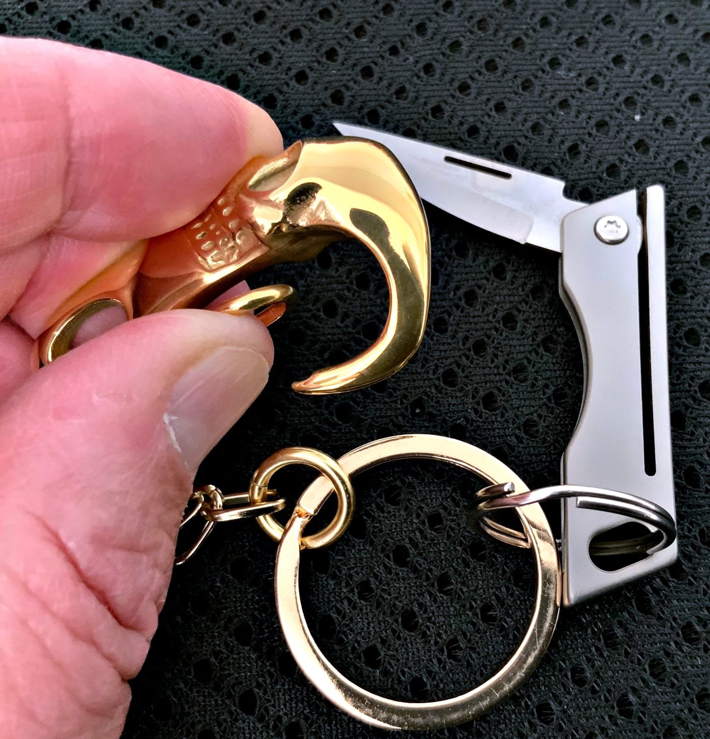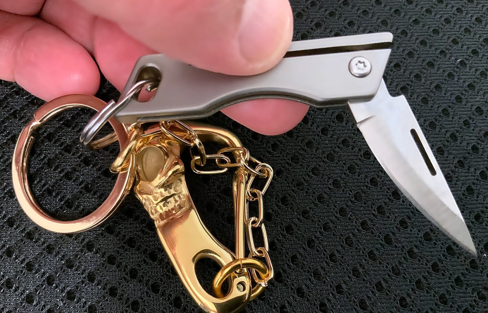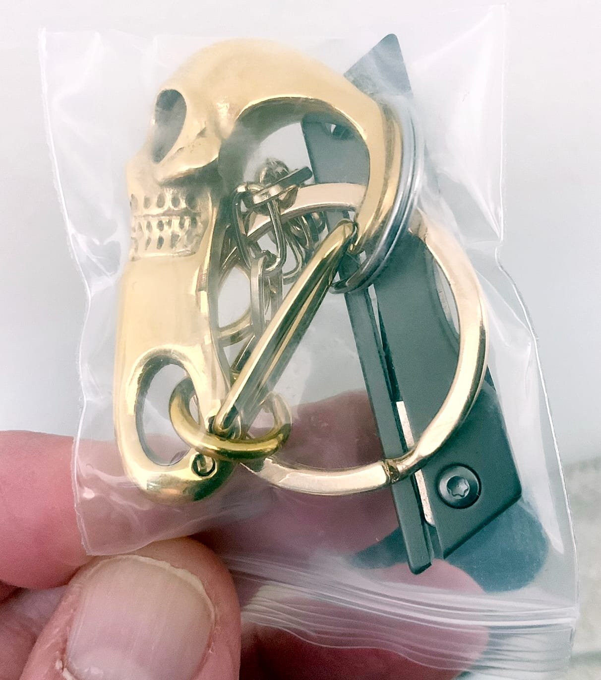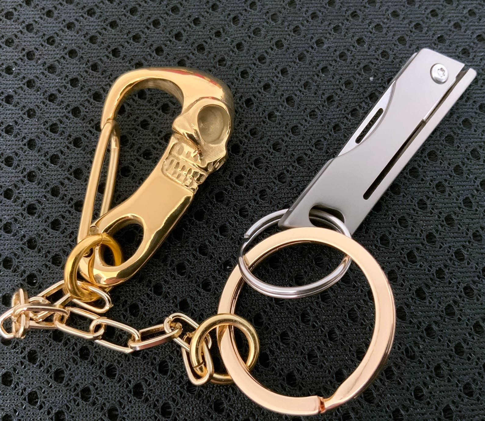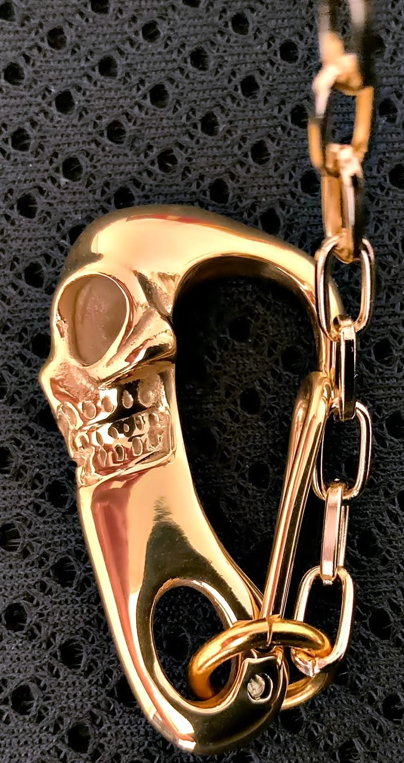 Why, don’t You Clip that KC Carabiner Titanium Skull on your Pant Loop and your good to go. The Chain (4mm Cable Silver Plated) is long enough to have the Knife and Keys in the Pant Pocket.